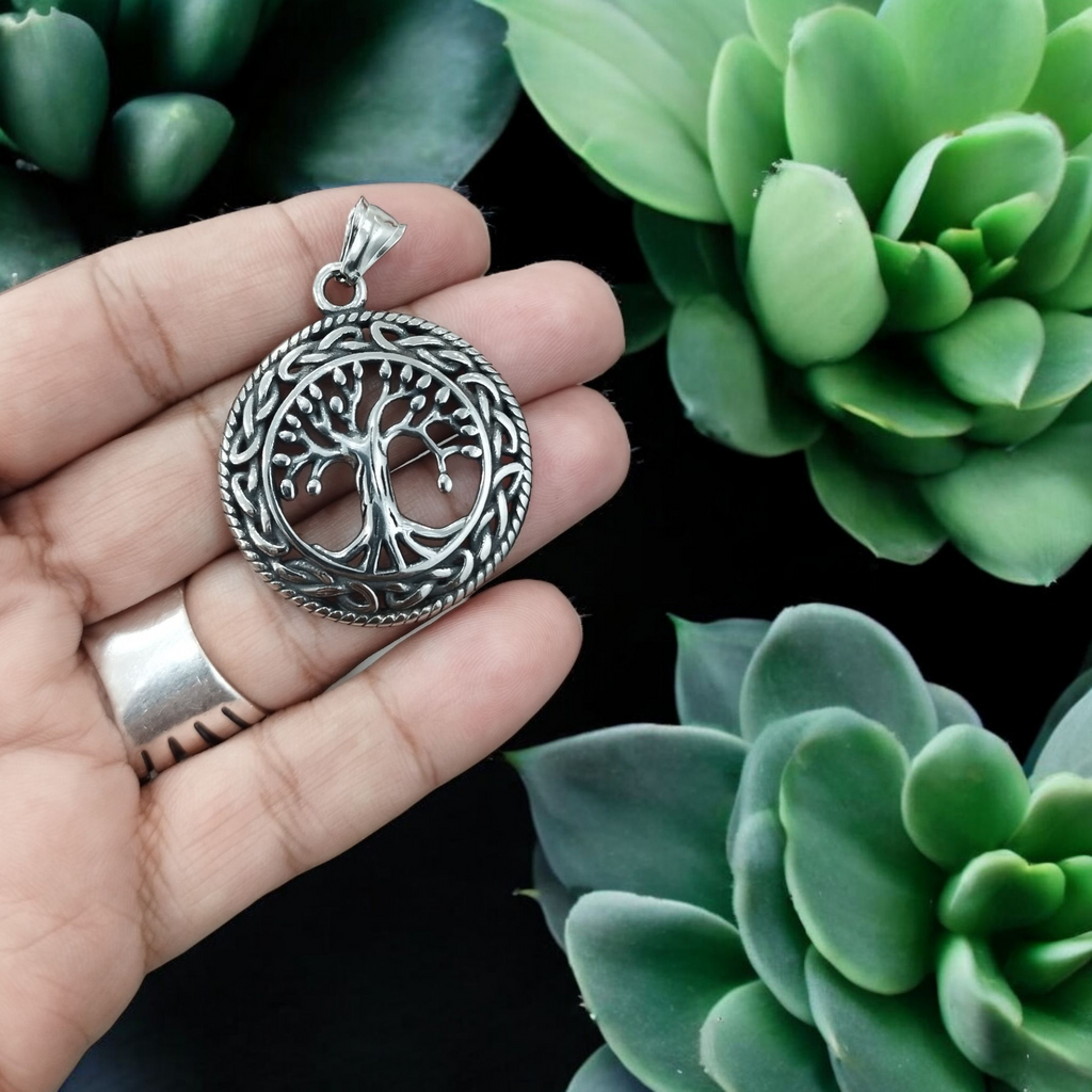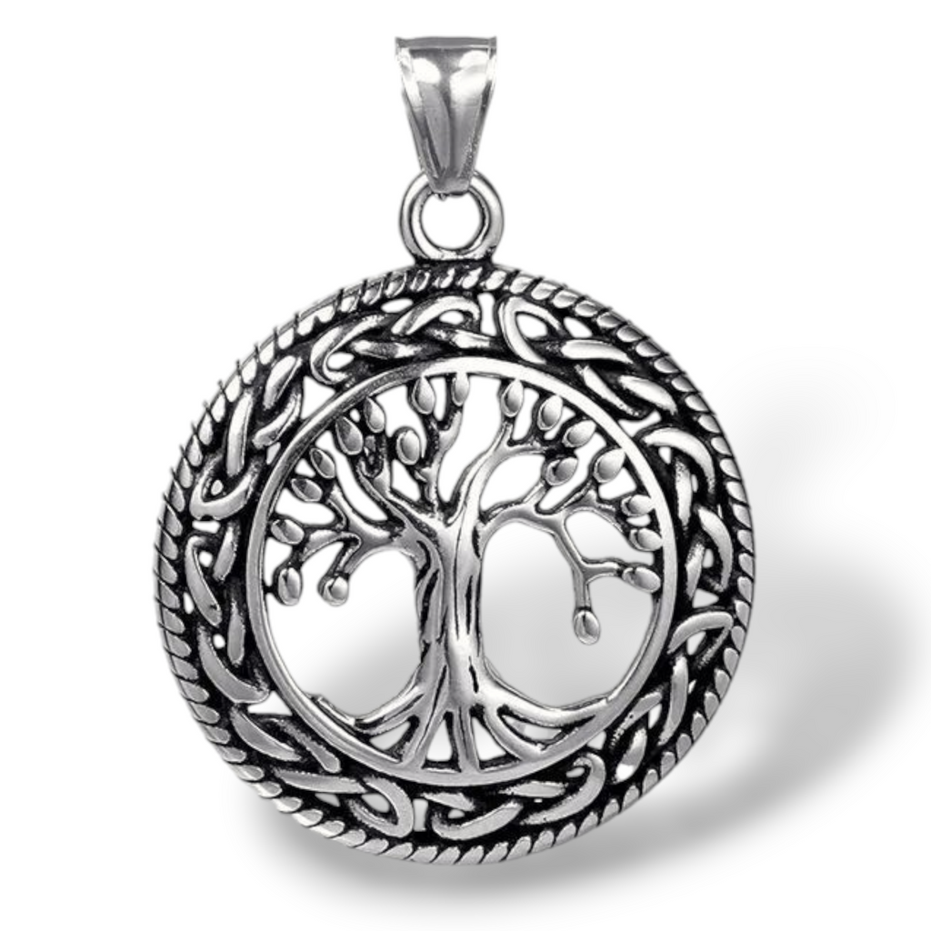 Medalla grande con diseño calado del árbol de la vida en acero inoxidable bruñido.