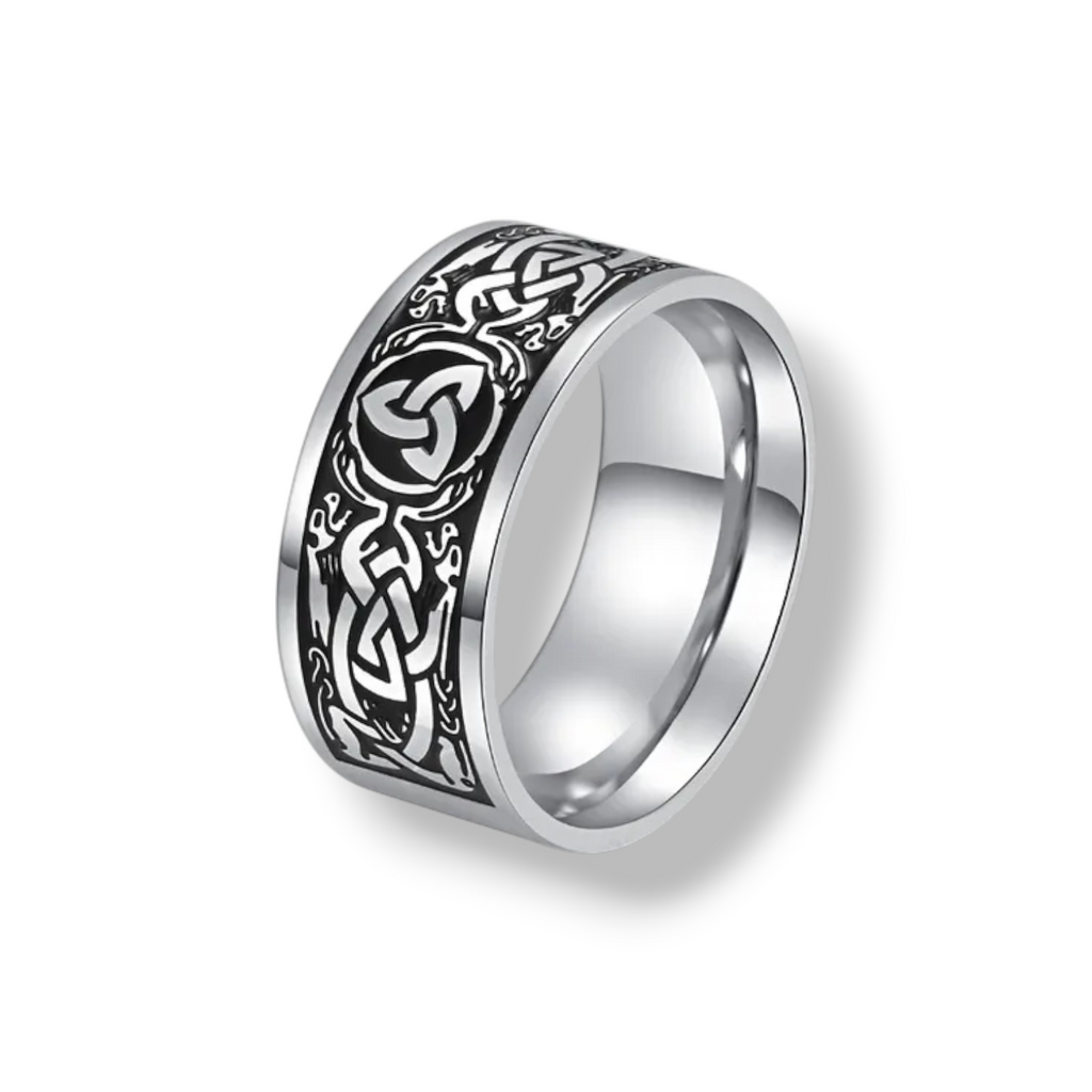 Anillo de acero inoxidable ancho diseño celta con triquetas.