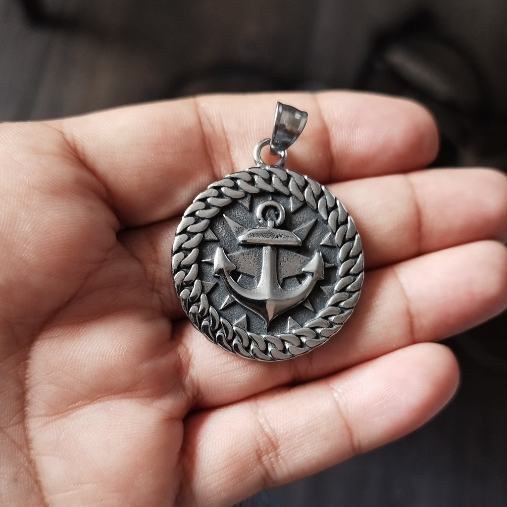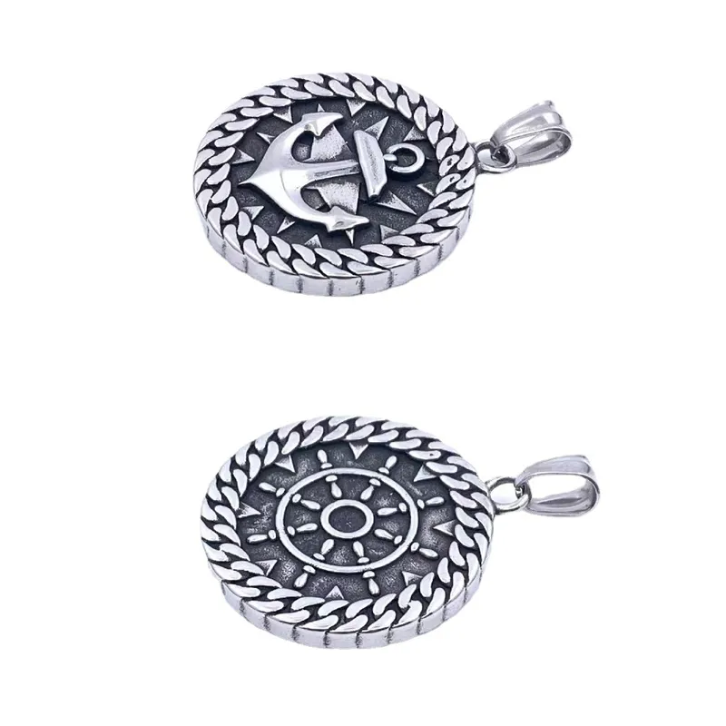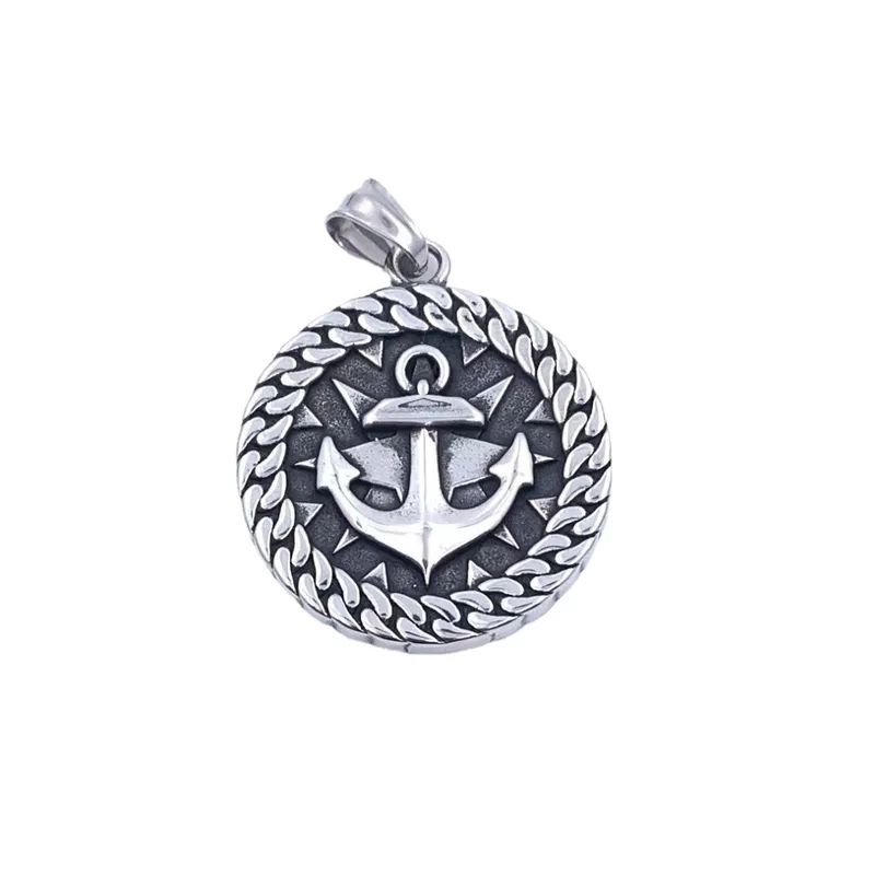 Dije grande redondo con diseño de ancla en acero inoxidable bruñido.