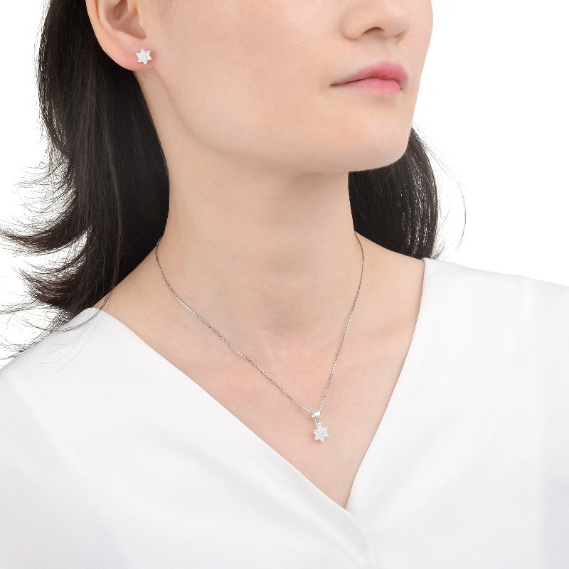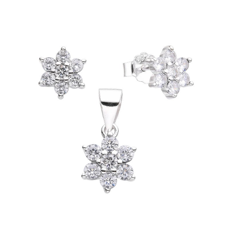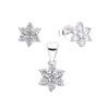 Juego de aretes y dije de flor pequeña de circones en plata 925.