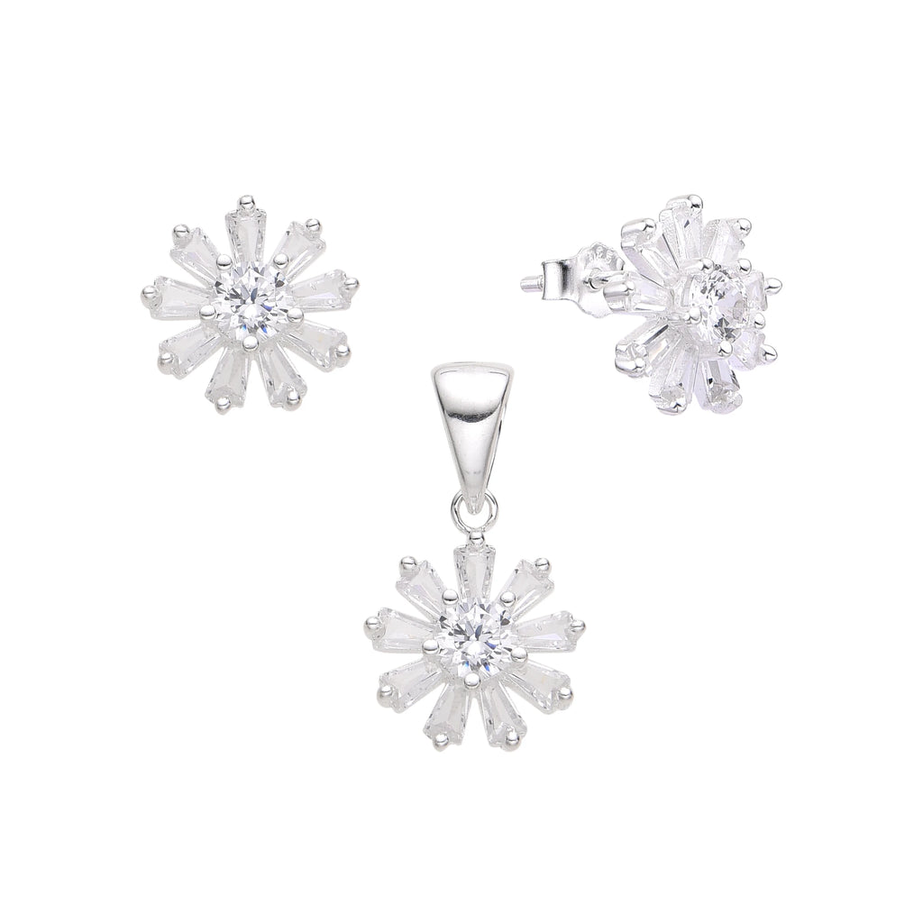 Detalles: Juego de aretes y dije de flor de circones en plata 925.